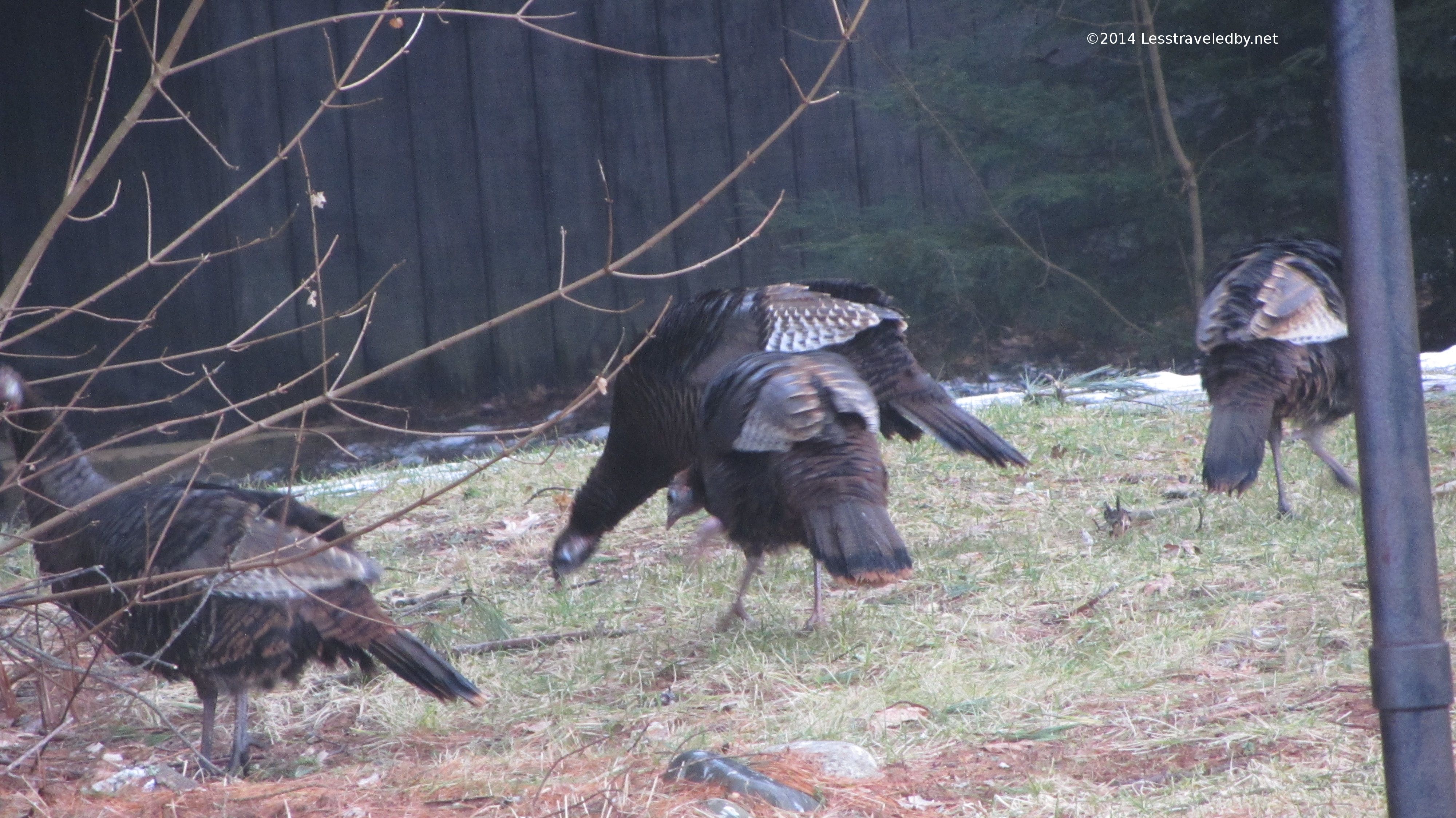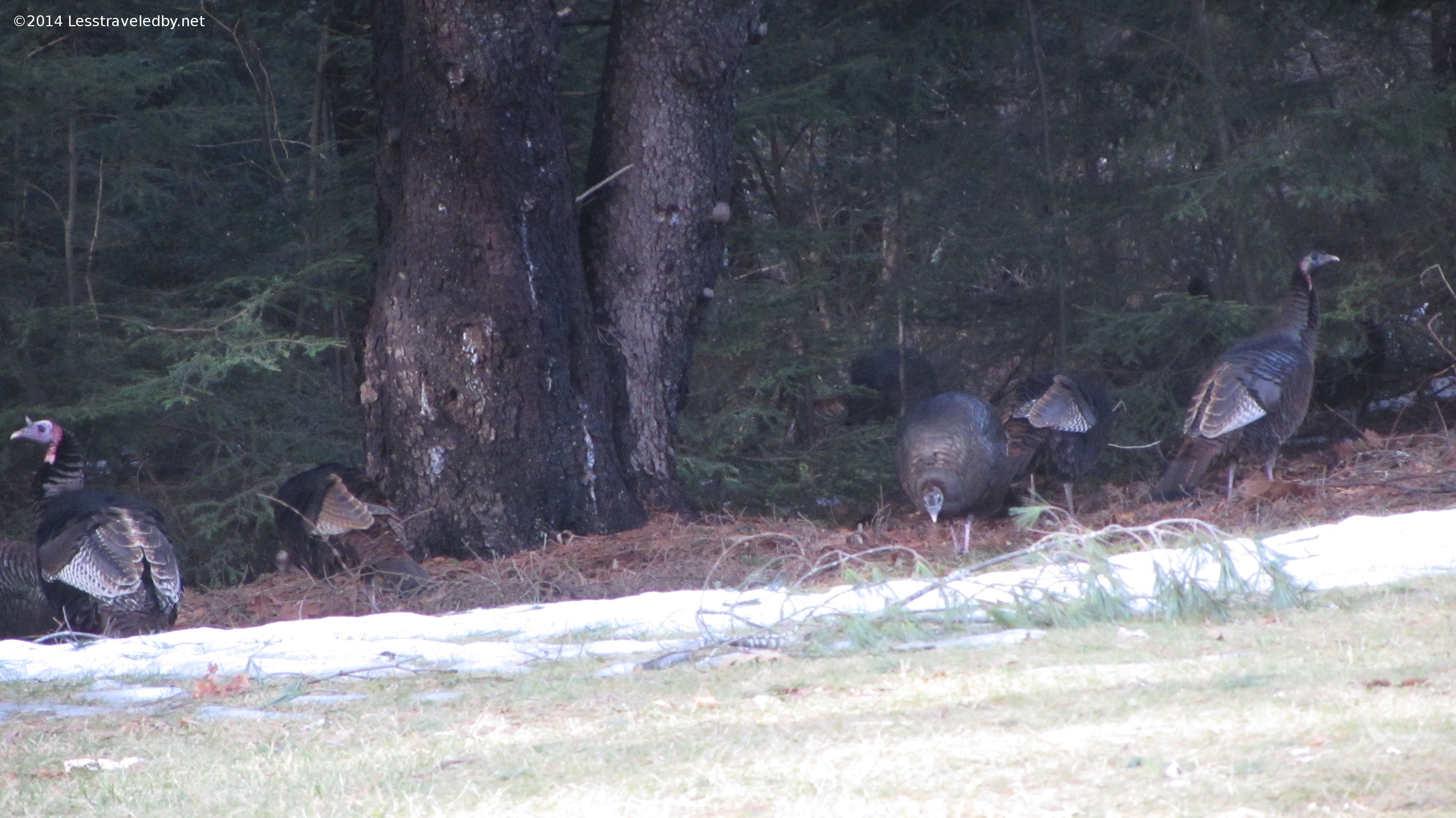 These wild turkeys are pretty pleased with the thaw. When the snow was a few feet deep behind the house they were nowhere to be seen. Now that there is some bare ground they have come out to the forest edge to feed.