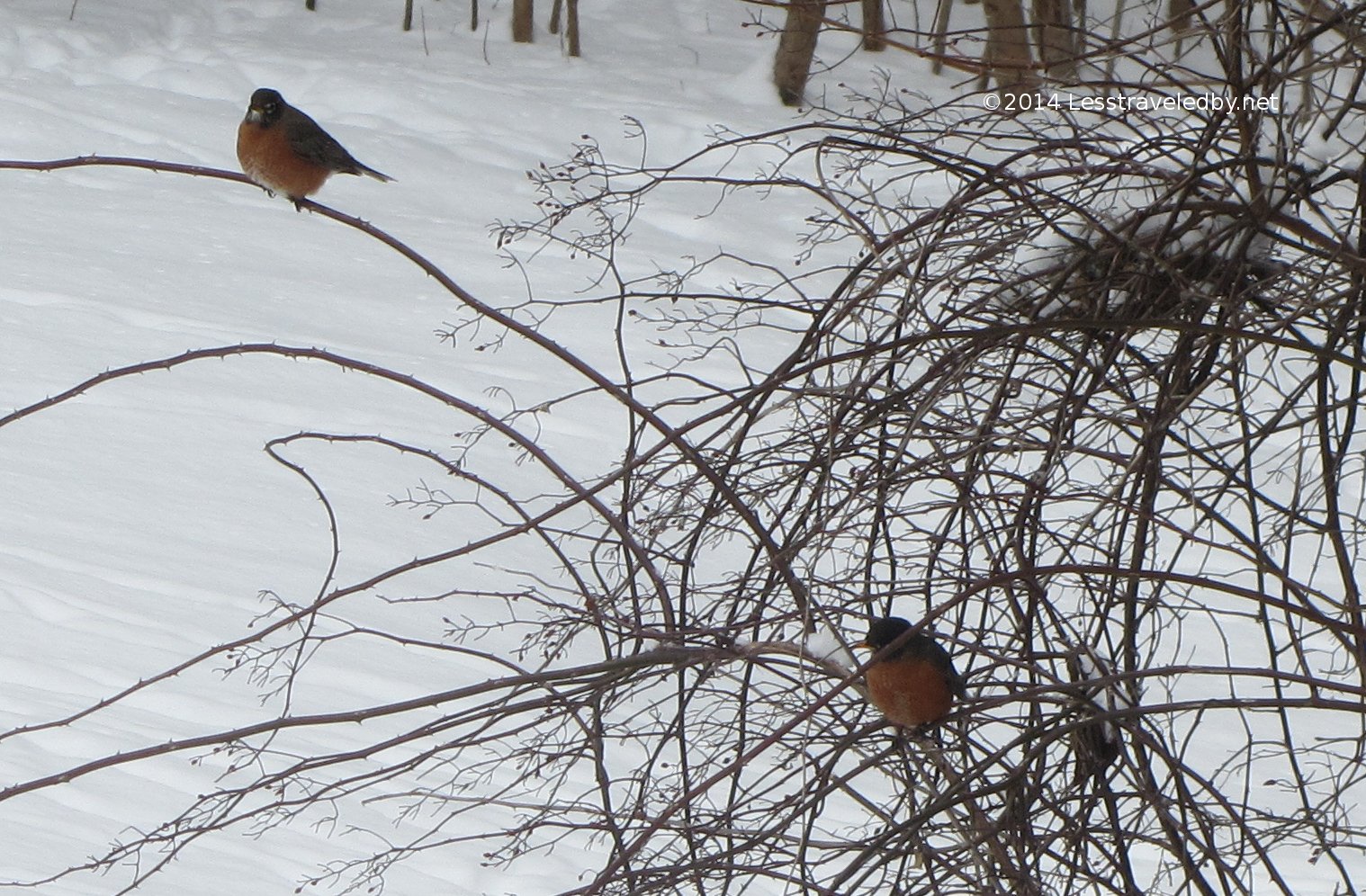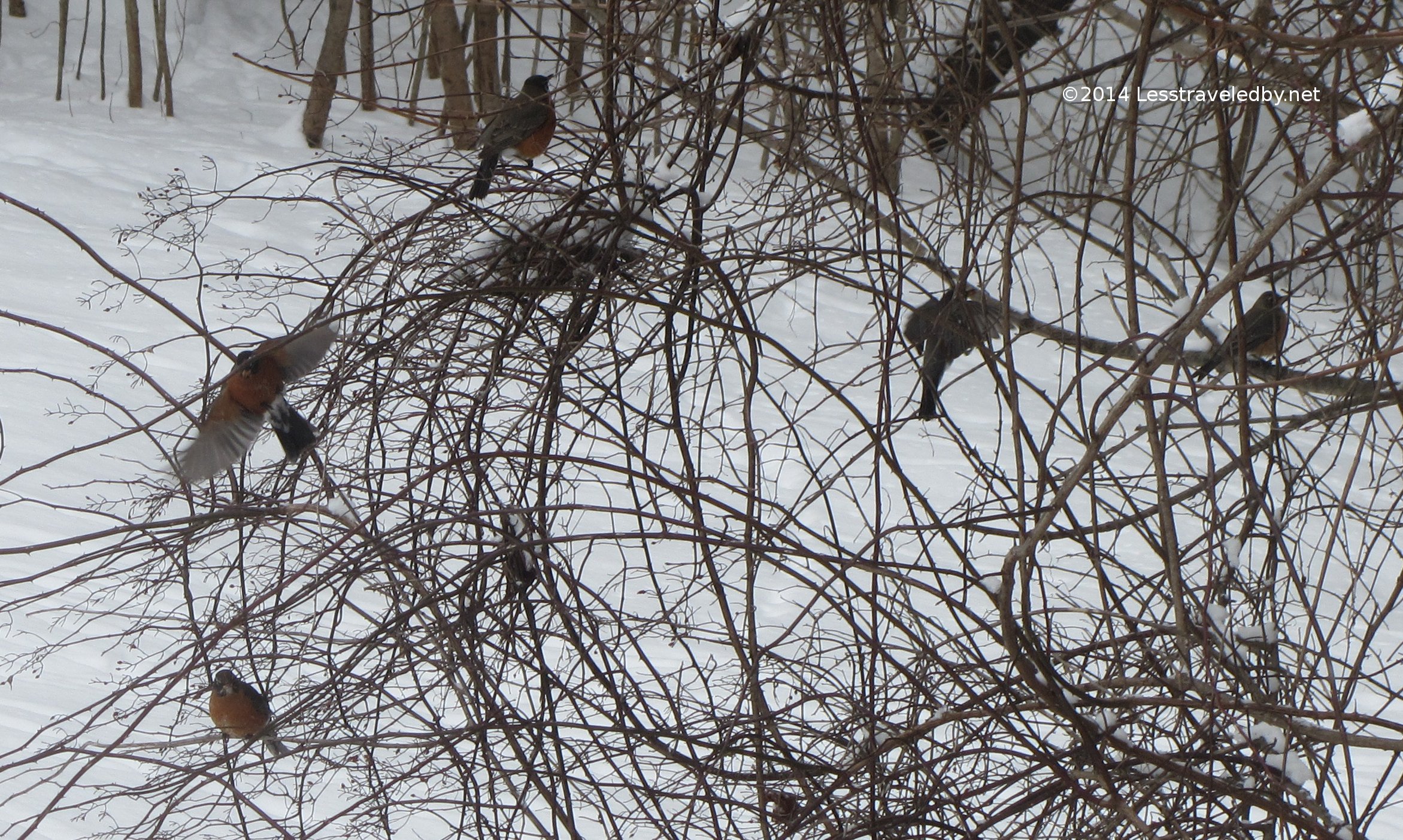 Such hope can be dangerous though if embraced too fully and then found to be false. The flock of robins in these pictures appeared near the end of the thaw. Likely following the warm air north they had enough time to get this far before Winter closed back in around them. Now their hope of an early Spring appears to have turned into a resolve not to freeze to death before it gets here. They are in almost constant motion, flitting from branch to branch in effort to keep warm.