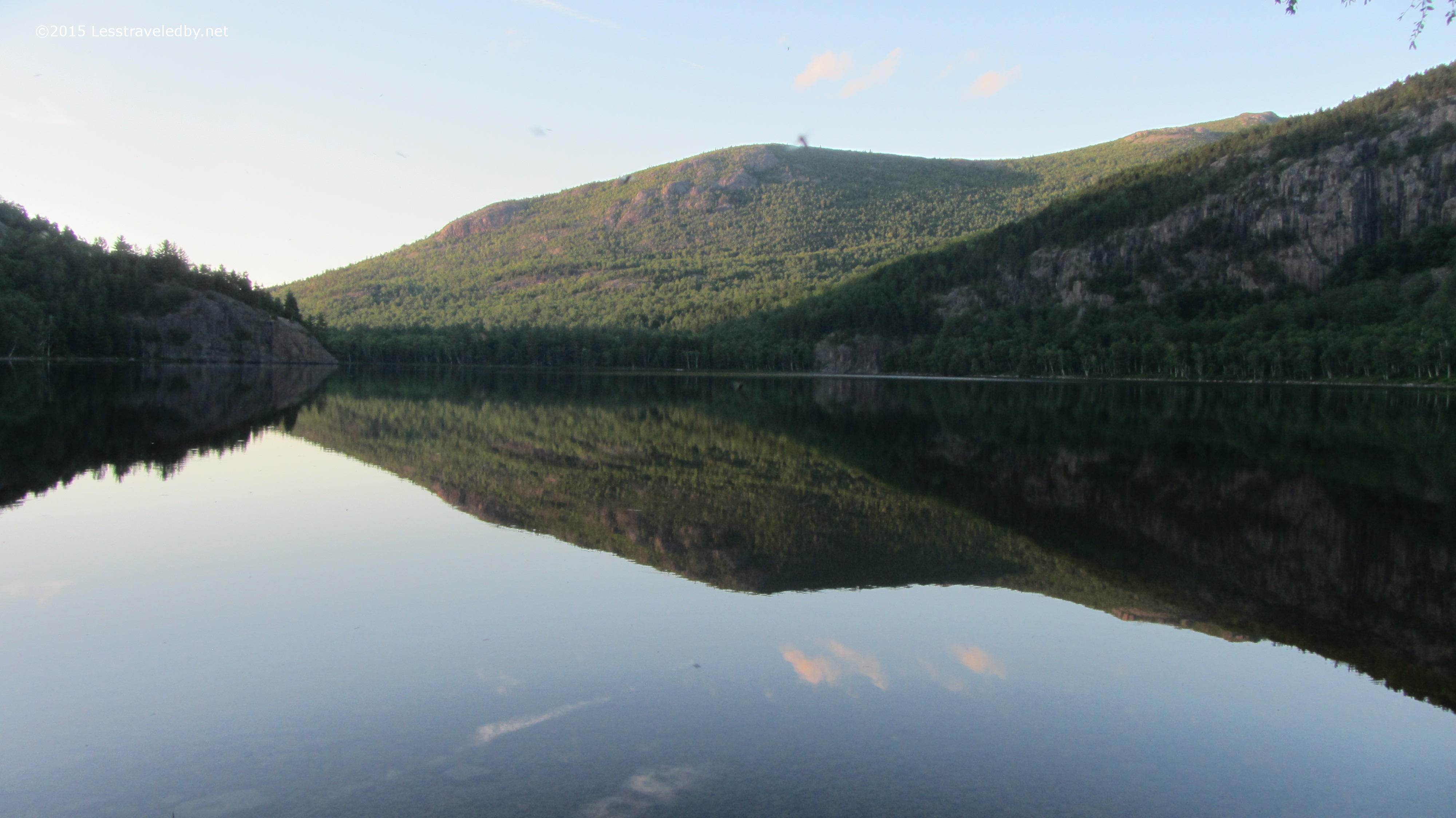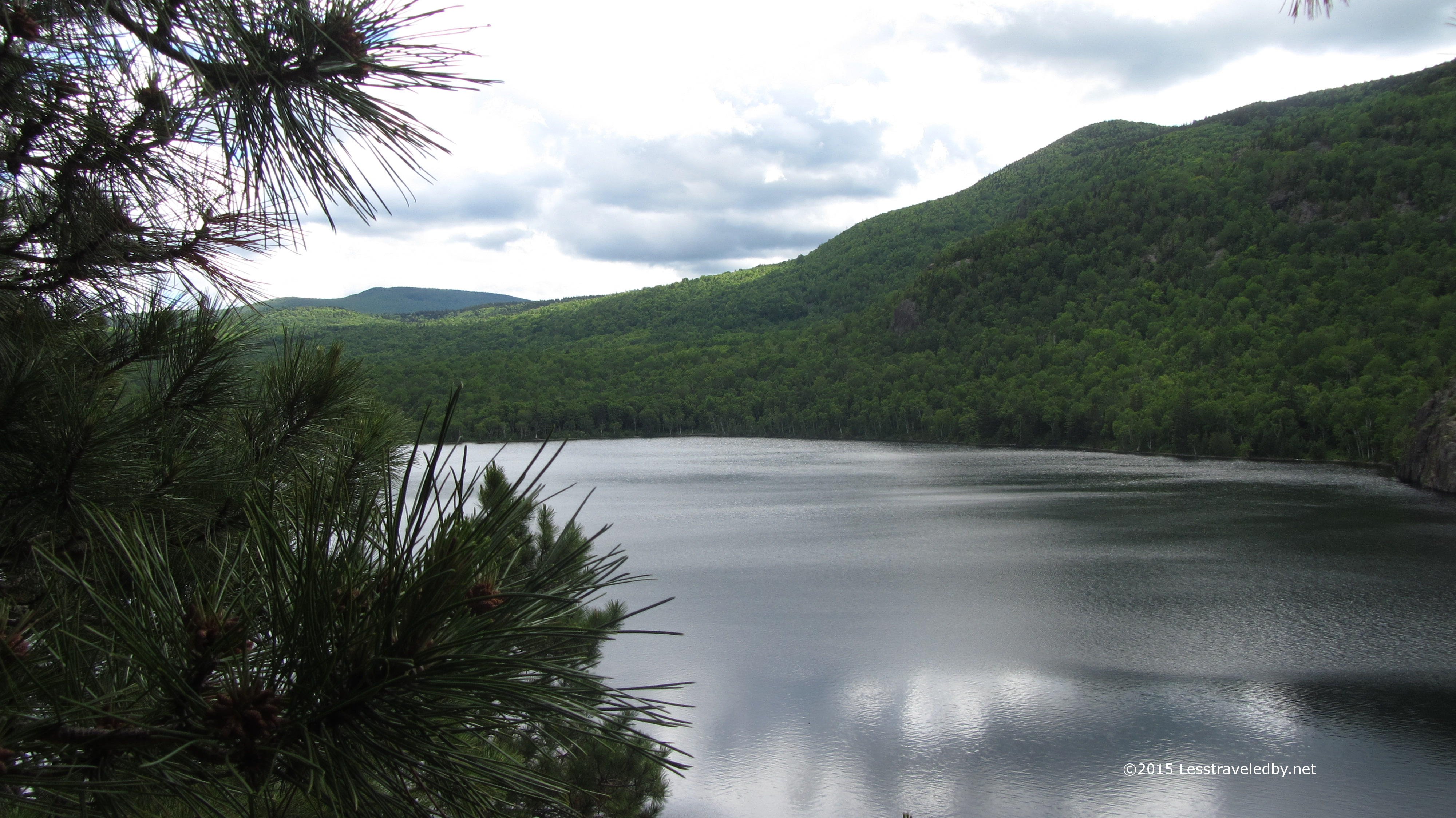 We had great weather to start and enjoyed the relaxing two miles or so we had to hike in to our site. Mostly flat with a big ridge in the middle it provided lots of different views of the pond. This view is from the camp site looking at the ridge we came over which sits at the base of the main part of the mountain and would be the start of our climb the following day.