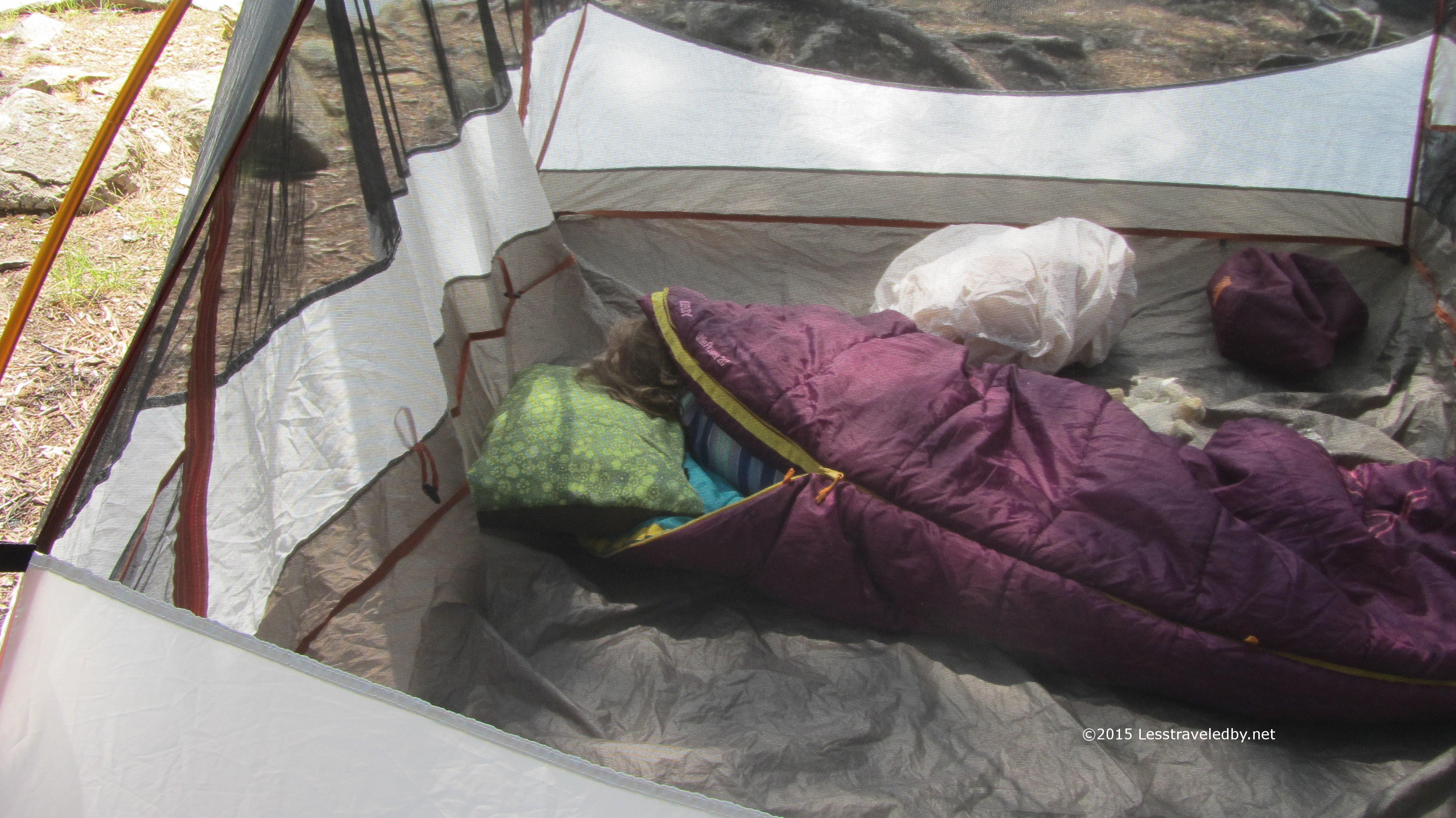 IMG_4746aThe roof was on the tent just in case, but furled to preserve the view. The Trail Ridge 3 is hard to fit between the roots at this site, but sleeping next to the pond is always restful.