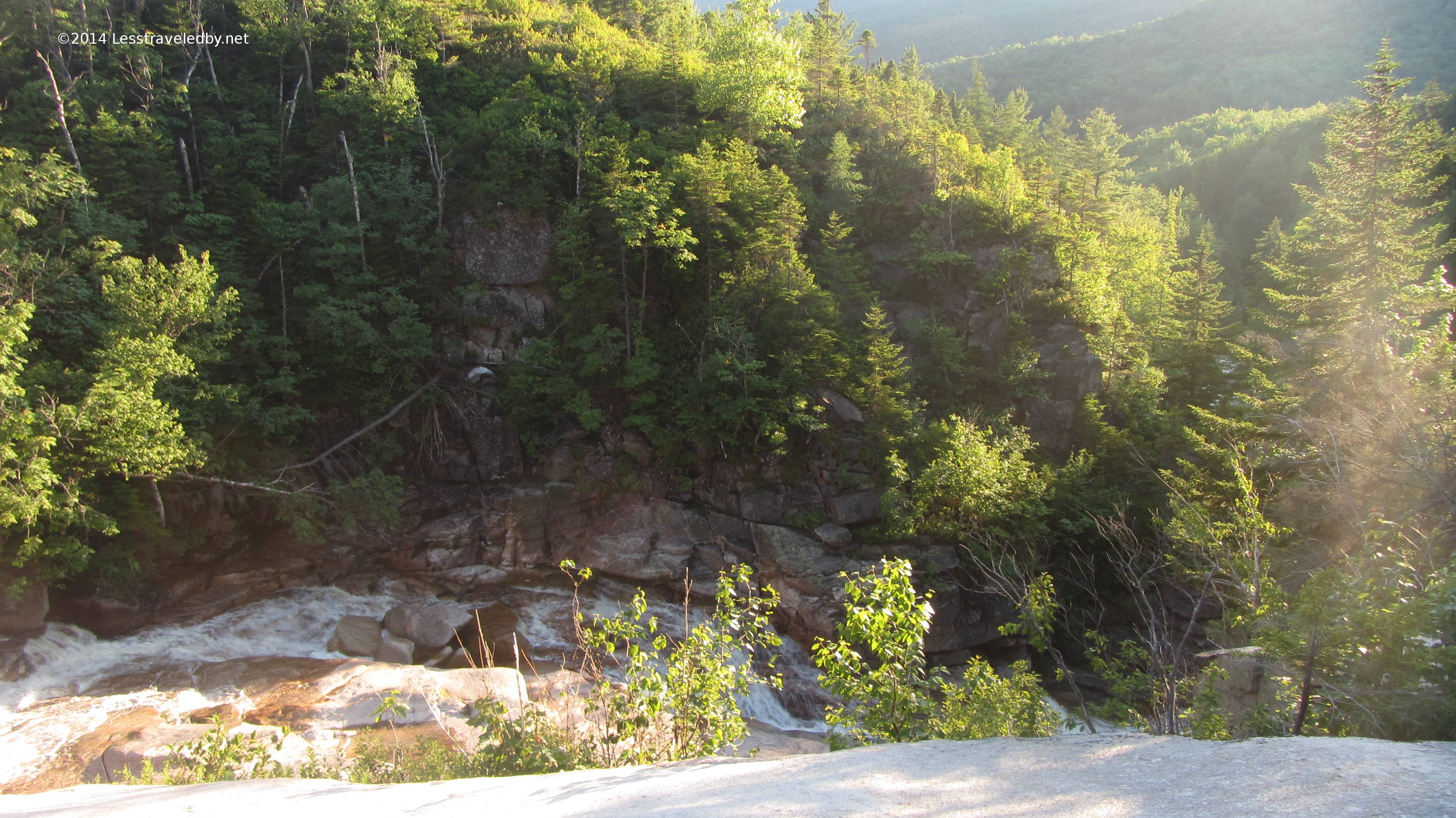 I think this was just before Zeacliff looking towards Carrigain, but I think this is about the time of day I started to feel the effects of too many Clif bars and too many rocky footfalls. The climb down from Zealand wasn’t as rocky as coming down Old Speck in Grafton Notch, but it was definitely a time to use the poles for speed braking. Somewhere towards the bottom I began to notice a twinge on the outside of my left knee. By the time I reached the Zealand Hut at the bottom I was feeling pretty thrashed. I might have been tempted to pay for the royal treatment if not for the large number of guests already there. This hut is reached via a pretty short and easy trail and has a nice waterfall to play in so is popular with families and those less inclined to scale mountains. The workers were getting ready to serve dinner as I scored some more water I didn’t have to filter and I have to admit it looked and smelled great. I didn’t though heh, so I skedaddled before I ruined anyone’s appetite.