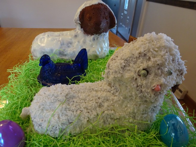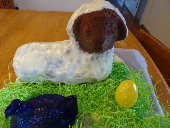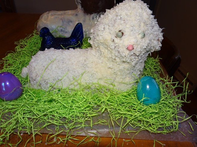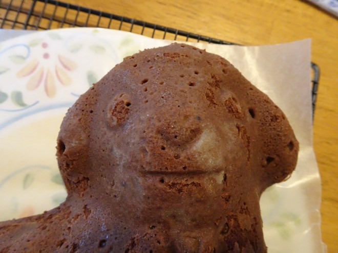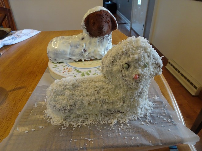 The chocolate pound cake lamb went wonderfully wrong. I didn’t trust the powdered cocoa and butter substitution for baking chocolate as it looked too dry so I threw in a cup or so of sour cream to lube the batter up before it hit the pan. The bonus cupcakes were fabulous so we have high hopes for the lamb cake.