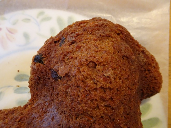 The carrot raisin lamb looks a bit like grandma’s poodle Snoopy, but it is upright and alert.