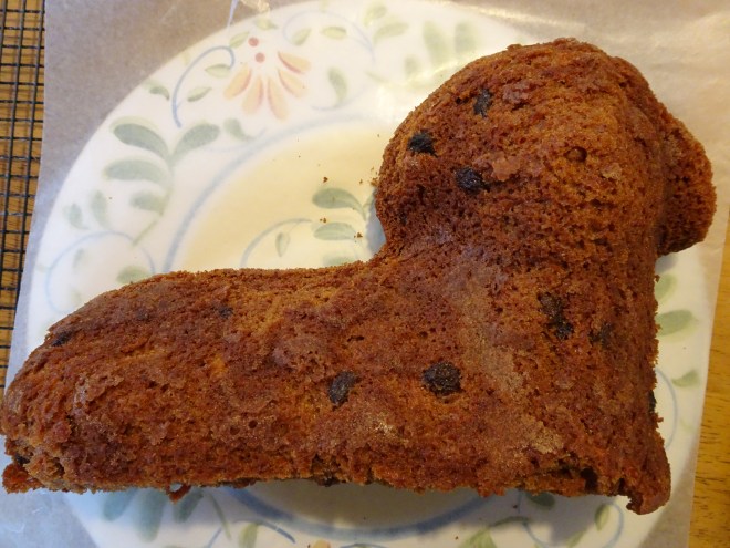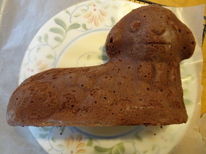 The chocolate pound cake lamb went wonderfully wrong. I didn’t trust the powdered cocoa and butter substitution for baking chocolate as it looked too dry so I threw in a cup or so of sour cream to lube the batter up before it hit the pan. The bonus cupcakes were fabulous so we have high hopes for the lamb cake.
