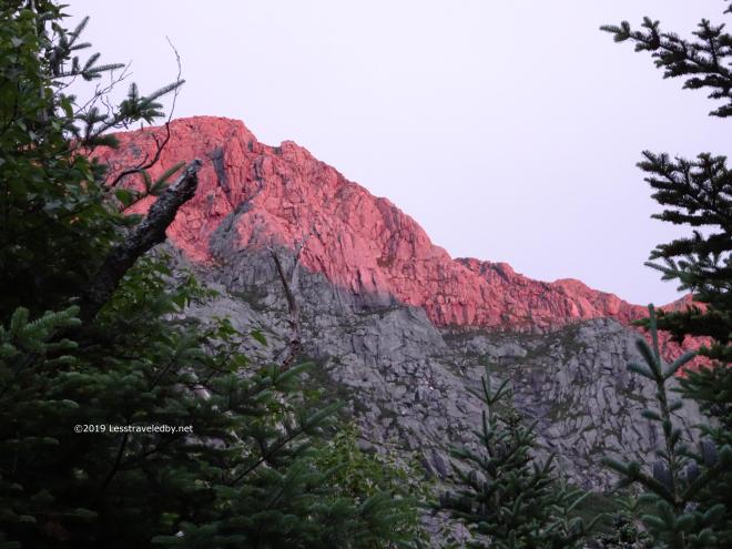 Alpenglow lighting up Pamola and the Knife Edge was a wonderful way to end an amazing day. Despite tired feet Frau Stranger ran down to the pond to experience it while I settled for camera zoom from the bear line.