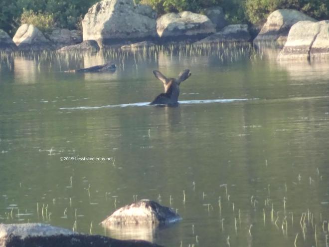 You probably didn’t notice the moose in that previous picture that was made with a GoPro. I ran back to camp and dug out the camera with better zoom to shoot this one on the far side of the lake.