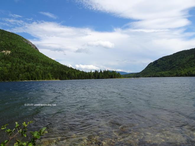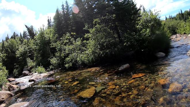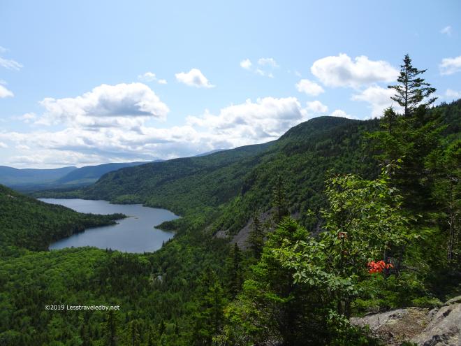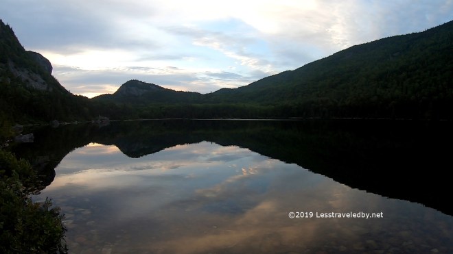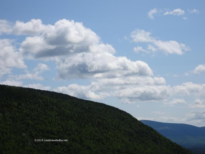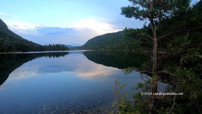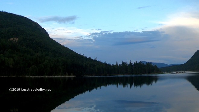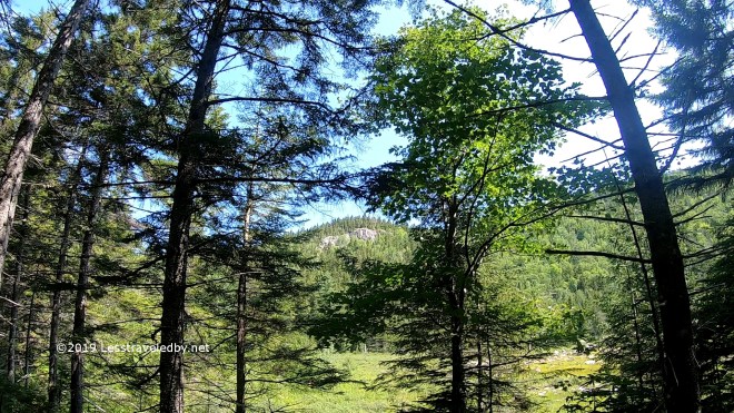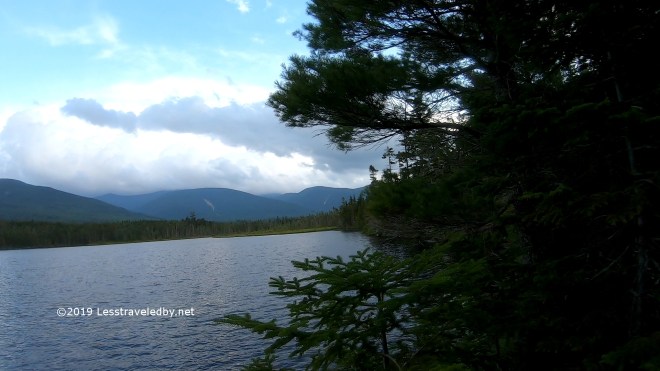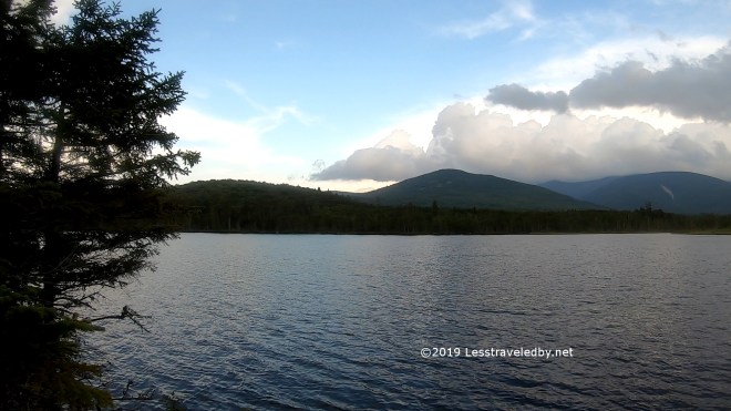 We’ve done this trail before with our daughter, so we knew despite our late start we could get to the Center Pond LT in time for dinner. Some blue sky and sunshine after the storm was appreciated.