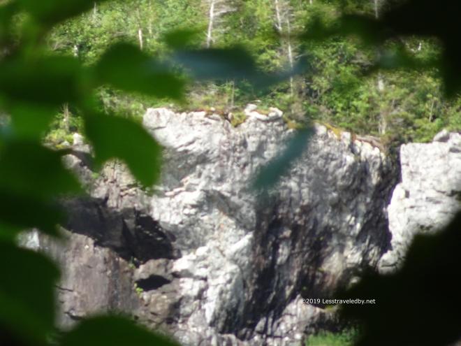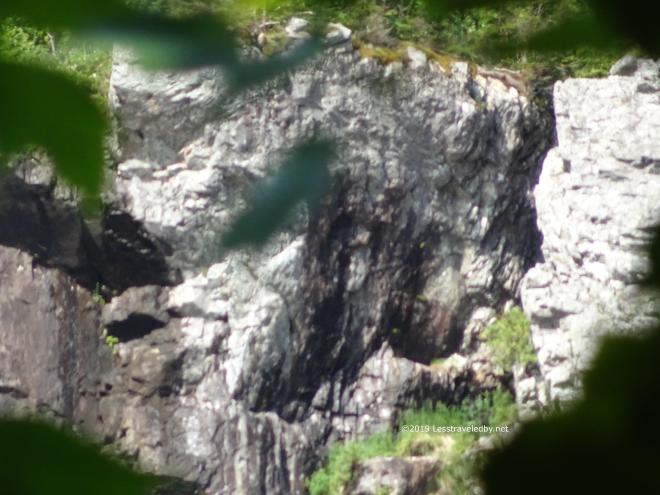 Those last two are shots of the top of the cliff looming over us. If I am going to carry that heavy camera with me I’m darn well going to play with it heh. I took a bunch of these super zooms, shooting through gaps in the leaves, until I realized I didn’t want to think about those big chunks falling down on me.