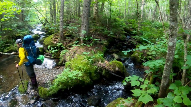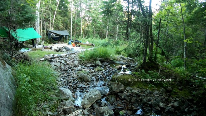 Thankfully there were plenty of small water crossings to help wash some of the mud off. This part of the trail is wet and sort of dark with lots of roll to the terrain. Neat to walk through, but always a pleasure to finish. There is one short, but steep climb at the end that makes it a joy to reach the spur to the tent site at the top.