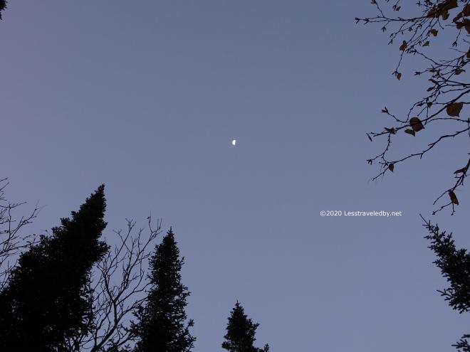 There is an open area that is totally exposed to the early afternoon sunshine, but the Little Wassataquoik Tent Site has a place to hide from it. This tree provides part of the canopy over what we like to call The Grotto 🙂