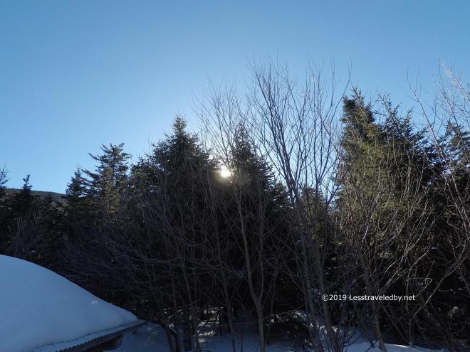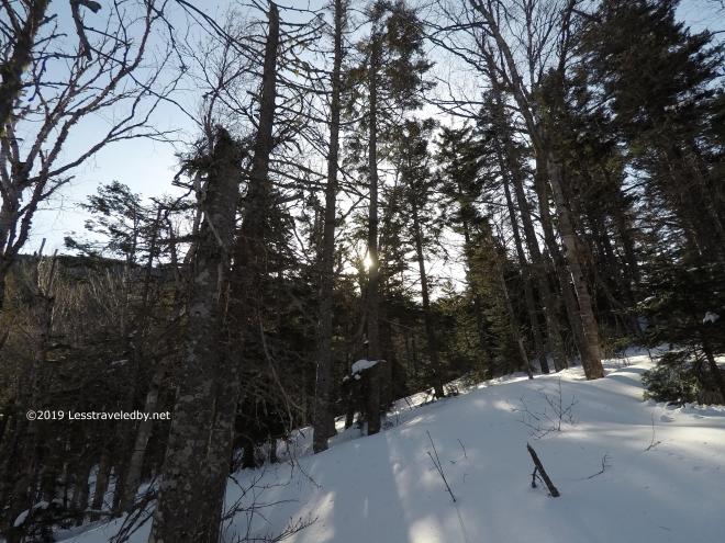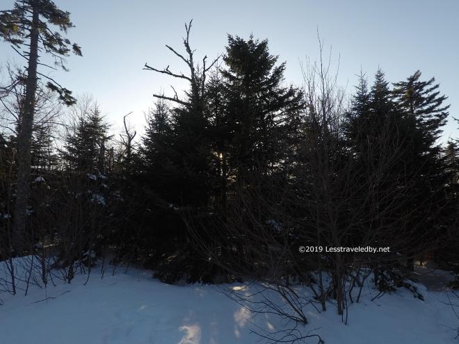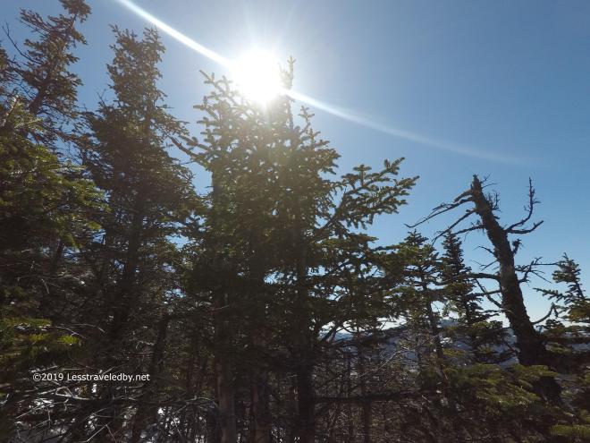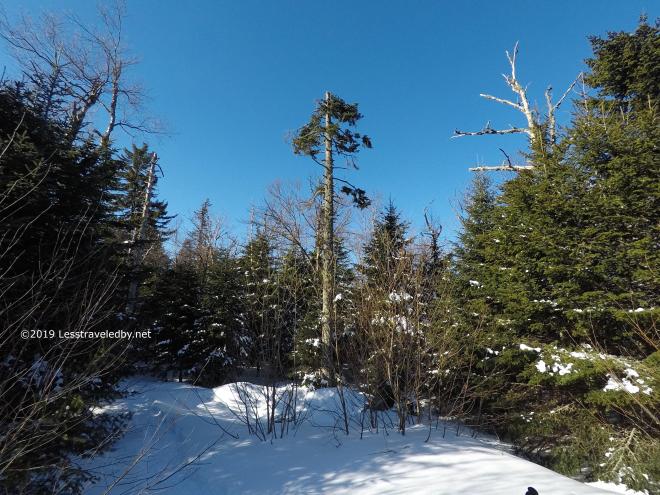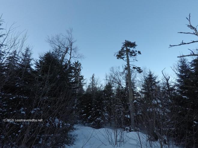 Looking towards the East peak is always tempting until stepping past these trees and into the full wind. I looked some, but didn’t go much farther.