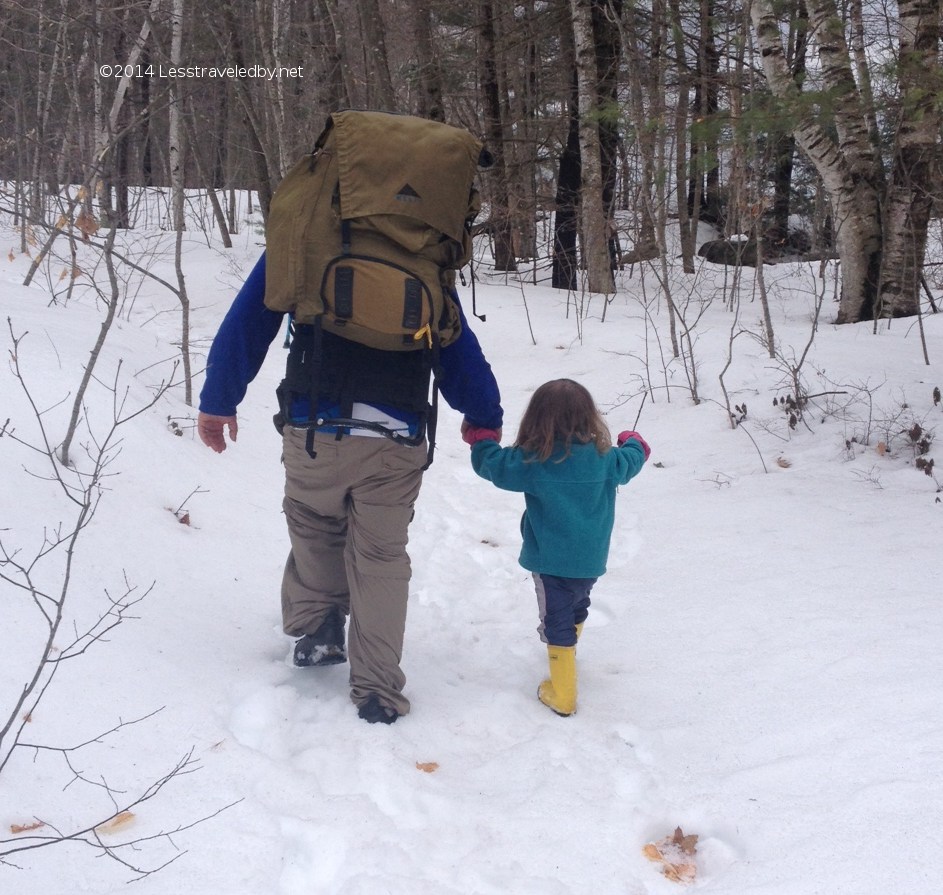 My daughter does her part to help.  She led my wife and I out the door yesterday on what I thought was going to be a walk around the block.  I tossed on the 50 pound pack thinking it would be a nice chance to work on those pack muscles.  Then she proceeded to lead us down the road, into the woods and all the way down to the river through soft mushy snow.  I was definitely feeling those pack muscles, but that girl is smart.  She knows Daddy is going to need strong legs this Summer for family trips.  Best to get me whipped into shape so when she is ready I’ll be able to carry her loads on the path less traveled by