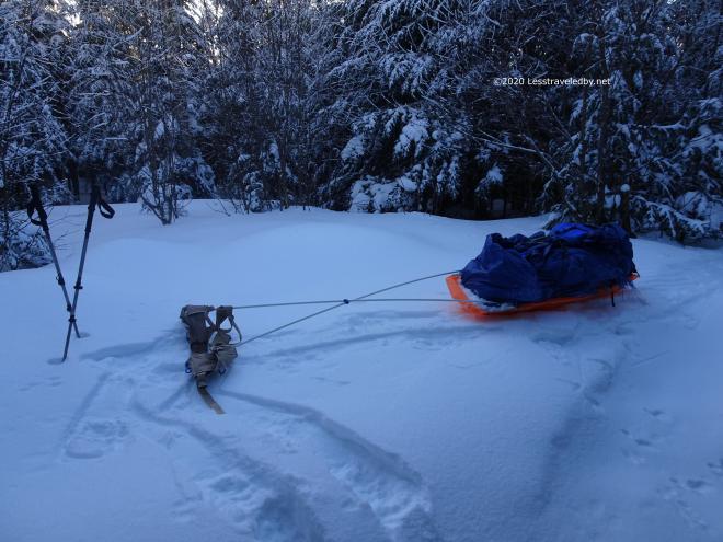The snow depth, while enough to cover most of the rocks, was a bit shallow for the sled. Deeper snow levels out the trail and buries obstructions. Pulling is easier and the sled tracks better.