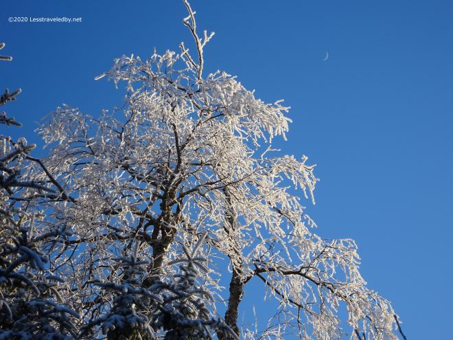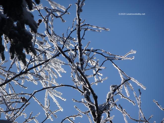 My usual lunch of cheese, sausage and tortillas was frozen solid when I pulled it out. The nuts and berries of my trail mix seemed hard enough to break a tooth. It was very pretty, but time to start heading down.