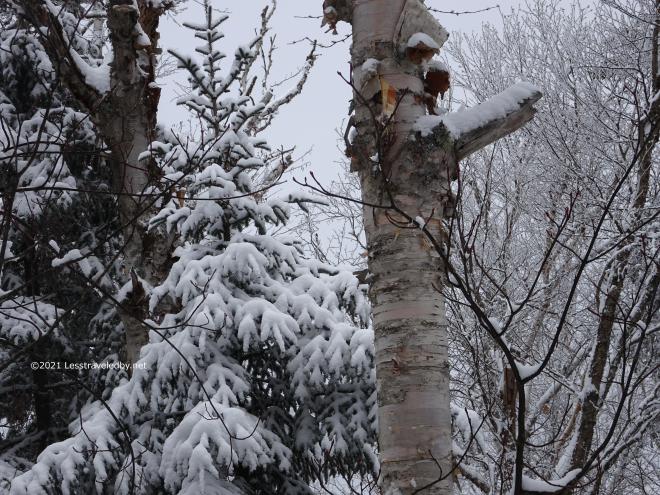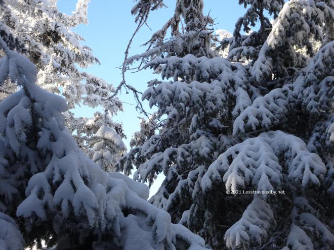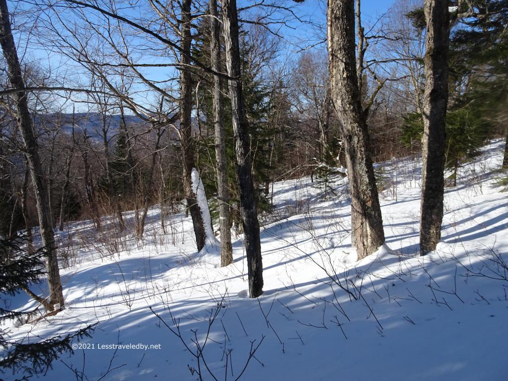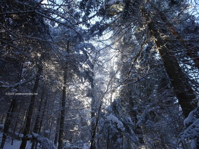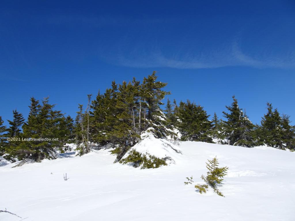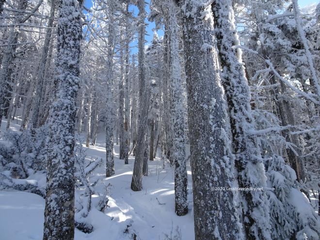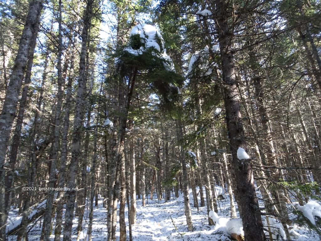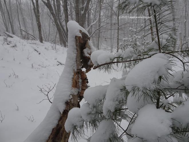 Looking towards the East peak is always tempting until stepping past these trees and into the full wind. I looked some, but didn’t go much farther.