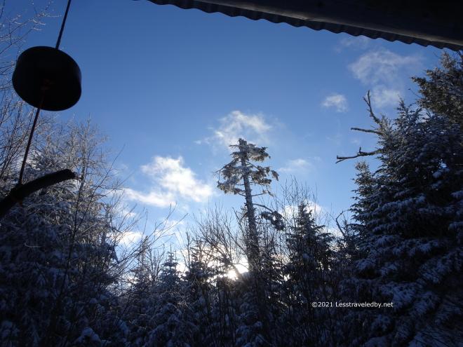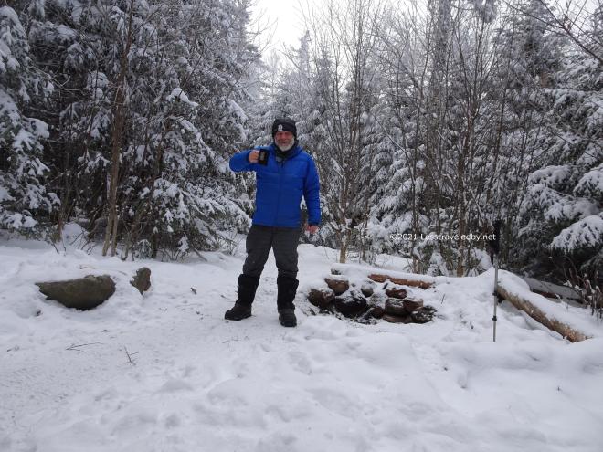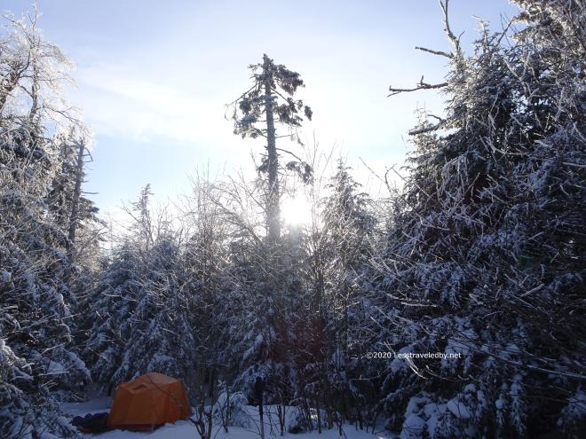 It was 14°f when I got up in the morning and cloudy. What else could I do but stand around and drink coffee while I waited to see what the weather would do? I was surprised by a trail runner who stopped in for a snack. He had already ran to the summit and back while I was drinking coffee! Soon after he left it started to clear and I headed up.