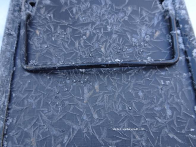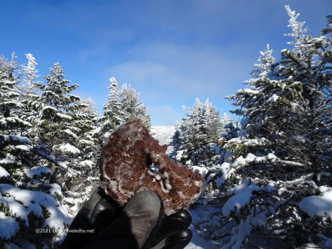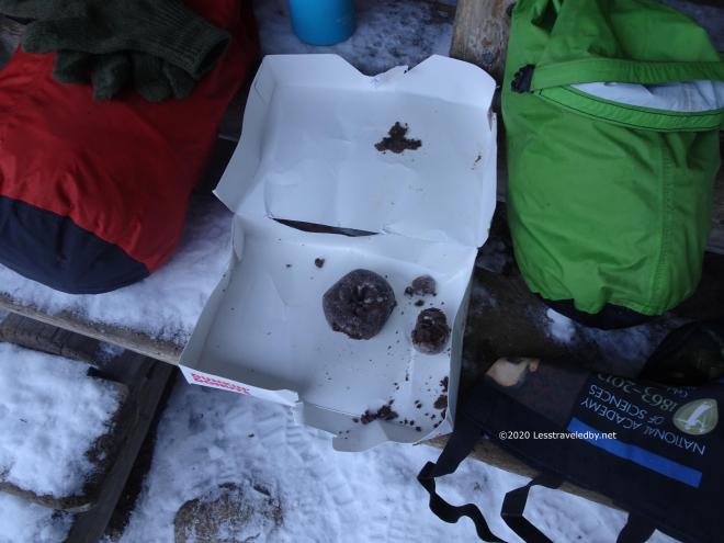 It does create the perfect frozen chocolate donut though!! A favorite treat on Winter backpacking excursions, the frozen donut takes at least 24 hours of frigid temperatures and a fair amount of smushing and crushing to reach perfection. This one was slightly better than that because it was really cold!