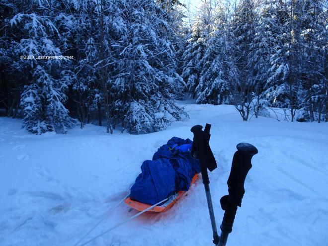 Then it was time to load the sled and head down the mountain. Somewhere near the road my tent popped off the sled. The shallow snow at the bottom was making it track poorly and it kept flipping over. I didn’t notice the tent was gone until I got home, hours later. I put out word and while I’ve had reports of it being spotted both in the woods and being picked up by a hiker, unfortunately the folks who picked it up haven’t found me yet.